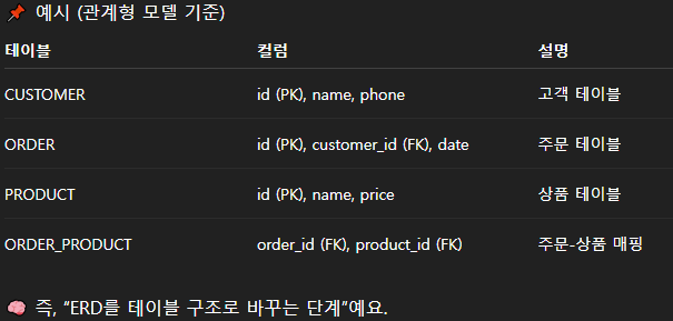 - **์ฆ, ๋ ผ๋ฆฌ์ ๋ชจ๋ธ์ DBMS์ ๋ฌผ๋ฆฌ์ ์ ์ฅ ๊ตฌ์กฐ๋ก ๊ตฌํํ๋ ๋จ๊ณ๋ก ๋ณผ ์ ์์ง๋ง, ์ค์ ๋ก๋ ๋ชจ๋ธ์ด๋ผ DB๋ฅผ ์ค์ ๋ก ๋ง๋ค๊ธฐ ์ง์ ์ ๋ง์ง๋ง ๋จ๊ณ์ด๋ค. ํ์ง๋ง, ์ค์ DB ์์ฑ SQL๋ก ๋ณํ์ด ๊ฐ๋ฅํ ์์ค์ผ๋ก ๋ณผ ์ ์์**.