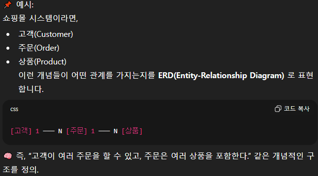 - ์ฆ, ํ์ค ์ธ๊ณ๋ฅผ ๋ฐ์ดํฐ๋ฒ ์ด์ค๋ก ์ฎ๊ธฐ๊ธฐ ์ ์ ๊ทธ๋ฆผ์ฒ๋ผ ํํํ๋ ๊ฐ๋ ์ ๋ชจ๋ธ๋ก ๋ณผ ์ ์๋ค.