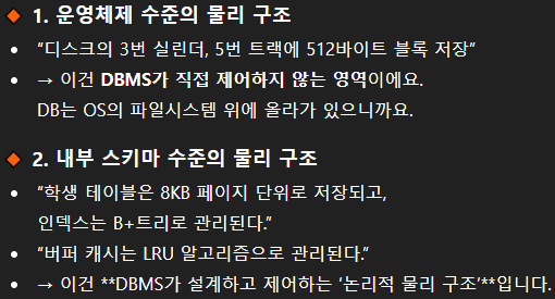 - ์ฌ์ฉ์ ์์ค๋ณด๋ค ๋ ํ์ ์์ค์ ์ ์ฅ์ฅ์น ์ ์ฅ์์ ๋ฐ์ดํฐ๊ฐ ์ด๋ป๊ฒ ์ ์ฅ๋์ด ์๋์ง์ ๋ํ ์ธ๋ถ์ ์ธ ์ฌํญ์ ๊ธฐ์ ํ๋ ๊ฐ๋ ์ ์ ๊ณตํ๋ค. ( ๋ ์ฝ๋ ํ์, ๋ ์ฝ๋ ์์, ์ ๊ทผ ๊ฒฝ๋ก ๋ฑ์ ์ ๋ณด ํํํ๊ณ ์ ๊ณตํจ. )