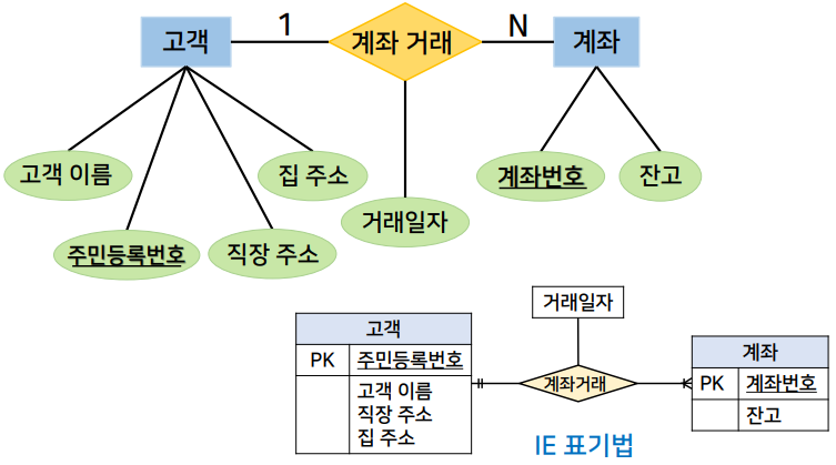 - ERD ์์๋ก๋, ์์ ๊ฐ์ด ๊ณ ๊ฐ ๊ฐ์ฒด์ ๊ณ์ข ๊ฐ์ฒด๋ฅผ ํตํด ๊ณ์ข ๊ฑฐ๋๋ผ๋ ๊ด๊ณ๊ฐ ๋ํ๋ ์ ์์.