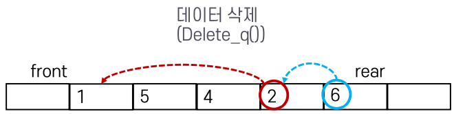 - ๋ฐ์ดํฐ๋ฅผ ๊บผ๋ด๋ ์์ (์ญ์ ์์ )์ ํ๋ฉด front ํฌ์ธํฐ๊ฐ ํ ์นธ์ฉ ์ด๋ํ๋ฉด์ ๋ฐ์ดํฐ๋ฅผ ๊บผ๋ด๋ฉด์ ์ญ์ ํ๊ฒ ๋๋ค.