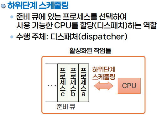 - ํ์๋จ๊ณ ์ค์ผ์ค๋ง: ์ค๋น ํ์ ๋ค์ด์ ์๋ ํ๋ก์ธ์ค๋ค ์ค CPU๋ฅผ ์ ์ ํ ํ๋ก์ธ์ค๋ฅผ ๊ฒฐ์ ํ๋ ๋จ๊ณ์ด๋ฉฐ, ์ด๊ณณ์์ ์ฌ์ฉ์ด ๋๋ ์ค์ผ์ค๋ฌ ์๊ณ ๋ฆฌ์ฆ๋ค์ด "CPU ์ค์ผ์ค๋ฌ ์๊ณ ๋ฆฌ์ฆ" ๋ค์.