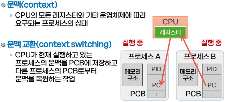 - ๋ฌธ๋งฅ: ํด๋น ํ๋ก์ธ์ค์ ๋ ์ง์คํฐ ๊ฐ ๋๋ ์ํ ๋ฑ์ ๋ฌธ๋งฅ์ด๋ผ ํ๋ฉฐ, ์ด๋ฌํ ๋ฌธ๋งฅ์ PCB์ ์ ์ฅ์ด ๋จ.