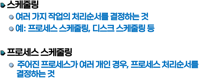 - ํ๋ก์ธ์ค ์ค์ผ์ค๋ง: ํ๋ก์ธ์ค๊ฐ ์ฌ๋ฌ ๊ฐ์ธ ๊ฒฝ์ฐ์ ํ๋ก์ธ์ค ์ฒ๋ฆฌ์์๋ฅผ ๊ฒฐ์ ํ๋ ๊ฒ์ ์๋ฏธํจ.
