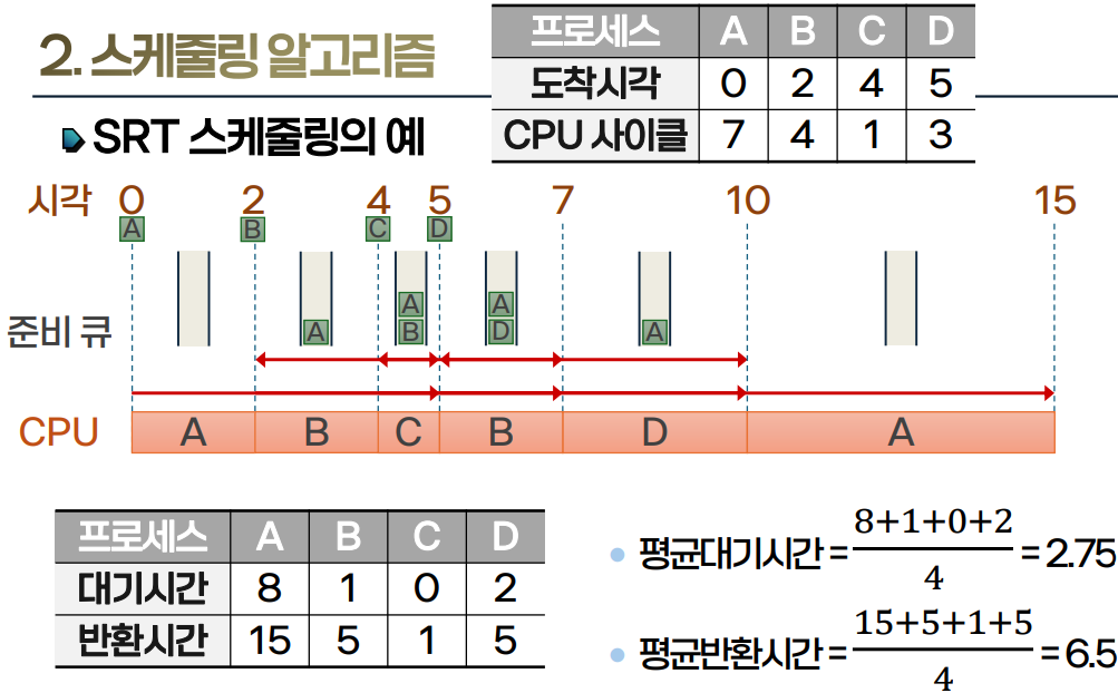 - ๋น์ ์ ๋ฐฉ์์ด๋ฏ๋ก, A ํ๋ก์ธ์ค๊ฐ CPU๋ฅผ ์ ์ ํ๊ฒ ๋๊ณ , ์ค๋น ํ์ B -> C๊ฐ ๋ค์ด์จ ์ํ์์ ๋ง์ฝ C๊ฐ ๋ ์งง๊ฒ ์ฒ๋ฆฌ๋ฅผ ํ ์ ์์ ๊ฒ ๊ฐ๋ค๊ณ ํ๋จ(CPU ์ฌ์ดํด ์๊ฐ ์ ์ ๊ฒ)์ด ๋๋ฉด ์ฐ์ ์์๋ฅผ ๋์ฌ์ ๋ฃ์ด์ฃผ๊ฒ ๋๊ณ , D๋ ๋ง์ฐฌ๊ฐ์ง๋ก C๋ณด๋ค๋ ๊ธธ๊ธฐ ๋๋ฌธ์ ๋ค์์ ๋ฃ์ด์ง์ง๋ง B ๋ณด๋ค๋ CPU ์ฌ์ดํด์ด ์งง๊ธฐ ๋๋ฌธ์ B๋ณด๋ค ์ฐ์ ์์๊ฐ ๋์์ง.