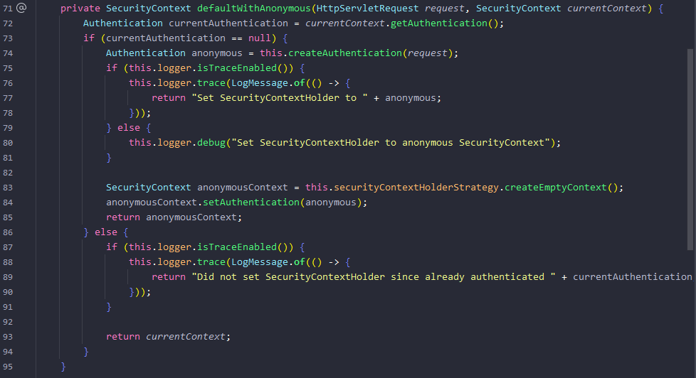 해당 필터 클래스 내부를 확인해보면 defaultWithAnonymous() 메서드가 존재하는것을 확인할 수가 있고 해당 메서드는 필터체인을 통해 현재 필터 클래스로 넘어왔을 경우 해당 메서드가 필수적으로 수행이 된다.