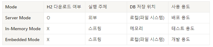 H2 Database는 Server Mode, In-memory Mode, Embeded Mode 세 가지 방식으로 사용할 수 있다.