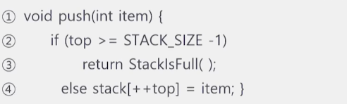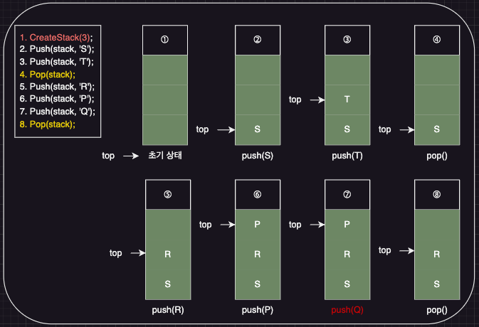- 6. Push(stack, 'P'): 'P' μ½μ ( μ΄ λΆλΆμμ Stack μ 곡κ°μΈ 3μΉΈμ΄ λ€ μ°¨λ²λ¦Ό. )