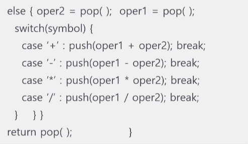 - oper2 , oper1 κ° λ³μμ pop() μ ν΅ν΄ stack μμ κ°μ λκ° μ κ±°νλ©΄μ 리ν΄μ λ°μ λ³μμ ν λΉμ ν¨.