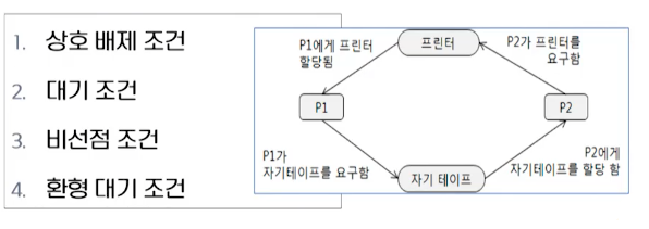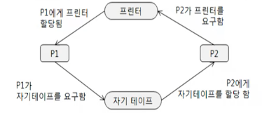 - λκΈ° 쑰건: νλ‘μΈμ€κ° μ μ΄λ νλ μ΄μμ μ»΄ν¨ν° μμμ ν λΉ λ°μ μ μ νκ³ μμΌλ©΄μ λ€λ₯Έ νλ‘μΈμ€κ° ν λΉ λ°μ μμμ μμ²νκ³ κ·Έκ²μ΄ ν΄μ λκΈ°λ₯Ό κΈ°λ€λ €μΌ νλ€. ( μ: νλ‘μΈμ€ Aκ° νλ¦°ν°λ₯Ό κ°μ§κ³ μμΌλ©΄μ, λμμ μ€μΊλλ₯Ό κΈ°λ€λ¦Ό. )