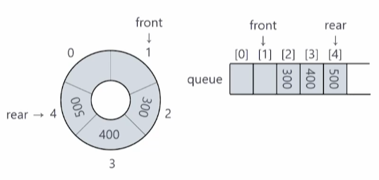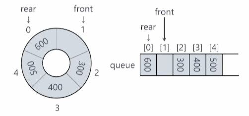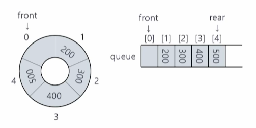 - μλ₯Ό λ€λ©΄, μμ λ§μ§λ§ μΈλ±μ€ 4λ²μ ν΄λΉ λ λ QueueSizeλ 5 μ΄λ―λ‘, -1μ νκ³ rear μ λΉκ΅νμ λ λ λ€ 4μ΄λ―λ‘, λ§μ§λ§ μΈλ±μ€λΌλ κ²μ μκ²λκ³ , μ΄ν rear μ 1μ λν΄μ£Όλ©΄ 5λ₯Ό μ»κ² λκ³ QueueSize(5) μ λͺ¨λλ‘ μ°μ°μ νλ©΄ 0μ΄λΌλ μ«μλ₯Ό μ»κ² λλλ° μ΄κ²μ΄ μ μΌ μ²« λ²μ§Έ μΈλ±μ€λ₯Ό κ°λ¦¬ν€λ κ΅¬μ‘°κ° λλ κ²μ.