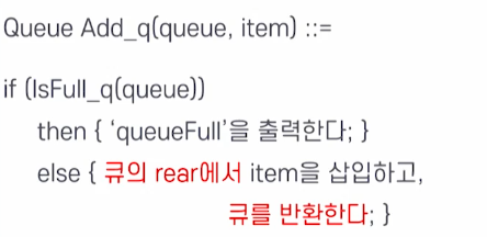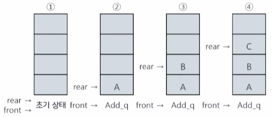 - (2) Add_q(queue, 'A'): νμ A κ°μ μ½μ ν΄λΉ λΆλΆμ rear ν¬μΈν° λΆλΆμ΄ λ¨. ( front λ νμ λμΌ -1 μμΉ )