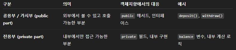 - μ¦, μΊ‘μνλ λ΄λΆ μ½λμ λ³κ²½μΌλ‘ μΈν΄ μΈλΆ μ½λμ μν₯μ΄ κ° μ μμΌλ―λ‘ λ§κΈ° μν¨μ.