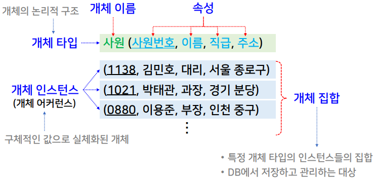 - ์ฝ๊ฒ๋งํด, ๋ฐ์ดํฐ๋ฒ ์ด์ค๋ฅผ ์ค๊ณํ ๋ ํ์ค ์ธ๊ณ์ ๋ฐ์ดํฐ๋ฅผ ๊ฐ๋ ์ ์ผ๋ก ํํํ๊ธฐ ์ํ ๋ชจ๋ธ์ด๋ค.