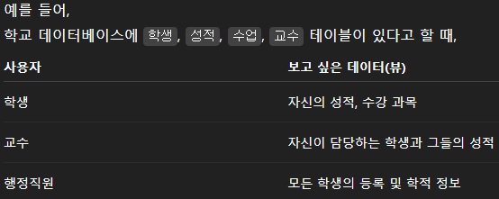 - DB์ ๋ํ ์ฌ๋ฌ ์ฌ์ฉ์์ ์๋ก ๋ค๋ฅธ ๊ด์ ์ ๋ฐ์ดํฐ ์๊ตฌ์ ๋ฐ๋ผ ๊ฐ์์ ํ์ํ ๋ถ๋ถ๋ง์ ์ ๋ณ์ ์ผ๋ก ์ถ์ถํด์ ๋ณด๋ ๊ธฐ๋ฅ