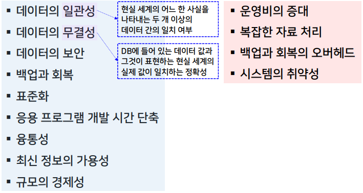 - ์์ ๊ธฐ์กด ํ์ผ ์ฒ๋ฆฌ ๋ฐฉ์์์ ํฅ์๋ ํน์ง ์ธ์๋ DB์๋ ๋ค์ํ ์ฅ์ ์ด ์กด์ฌํ๋ ๋ฐ๋ฉด ๋จ์ ๋ ์กด์ฌํจ.