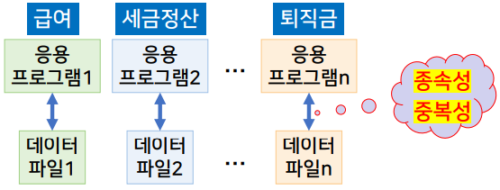 - ๊ธฐ์กด ํ์ผ ์ฒ๋ฆฌ ์์คํ ์ ์์ฉ ํ๋ก๊ทธ๋จ๊ณผ ๋ฐ์ดํฐํ์ผ ๊ฐ์ 1:1 ๊ด๊ณ๋ฅผ ๊ฐ์ง๊ณ ์์.
