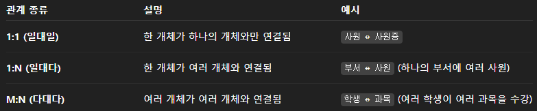 - ๊ฐ์ฒด์ ๊ฐ์ฒด๊ฐ ๋ช ๋ช ์ฉ ์ฐ๊ฒฐ๋๋์ง์ ๋ฐ๋ผ ๋ค์๊ณผ ๊ฐ์ด 1:1, 1:N, N:1, M:N ์ผ๋ก ๋๋๊ฒ ๋๋ค.