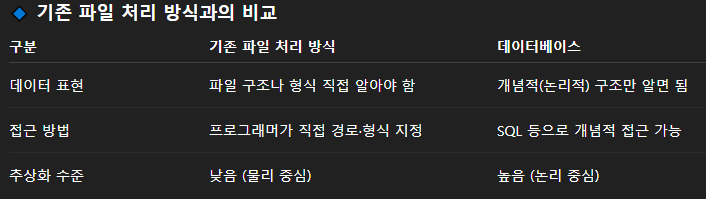 - ๊ฒฐ๋ก : ์ด๋ฌํ ํ์ผ ์ฒ๋ฆฌ ์์คํ ์ ๋ฌธ์ ์ ๋๋ฌธ์ ๋ฐ์ดํฐ๋ฒ ์ด์ค๊ฐ ๋ง๋ค์ด์ง.