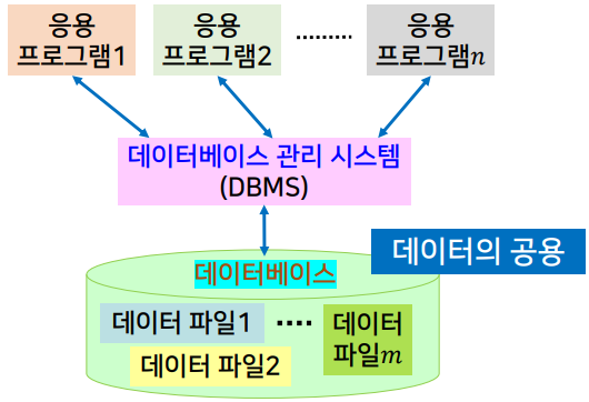 - ํ์ง๋ง, ๋ฐ์ดํฐ๋ฒ ์ด์ค๋ ๋ฐ์ดํฐ๋ฅผ ํ ๊ณณ์ ๋ณด๊ดํจ์ผ๋ก์จ ์์ฉ ํ๋ก๊ทธ๋จ๊ณผ ๋ฐ์ดํฐ๊ฐ์ 1:N ์ ๊ด๊ณ๋ฅผ ๊ฐ์ง. ( ๋ฐ์ดํฐ์ ๊ณต์ฉ )