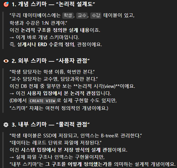 - ( ์คํค๋ง๋ ์ค์ ๋ฌผ๋ฆฌ์ ๊ตฌํ๋ฌผ์ด ์๋ "๋ฐ์ดํฐ๋ฒ ์ด์ค ๊ตฌ์กฐ๋ฅผ ์ ์ํ ์ค๊ณ(๊ด์ ) ์. )