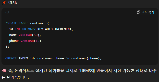 - **์ฆ, ๋ ผ๋ฆฌ์ ๋ชจ๋ธ์ DBMS์ ๋ฌผ๋ฆฌ์ ์ ์ฅ ๊ตฌ์กฐ๋ก ๊ตฌํํ๋ ๋จ๊ณ๋ก ๋ณผ ์ ์์ง๋ง, ์ค์ ๋ก๋ ๋ชจ๋ธ์ด๋ผ DB๋ฅผ ์ค์ ๋ก ๋ง๋ค๊ธฐ ์ง์ ์ ๋ง์ง๋ง ๋จ๊ณ์ด๋ค. ํ์ง๋ง, ์ค์ DB ์์ฑ SQL๋ก ๋ณํ์ด ๊ฐ๋ฅํ ์์ค์ผ๋ก ๋ณผ ์ ์์**.