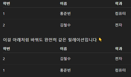 - μ¦, ν μ΄λΈμμ νμ μμλ μμκ° λ°λμ΄λ μλ―Έλ λμΌνλ€λ λ»μ.