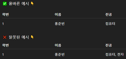 - μ½κ²λ§ν΄, κ° μ»¬λΌμλ 미리 μ ν΄μ§ μλ£ν(λ°μ΄ν° νμ )μ κ°λ§ λ€μ΄μ¬ μ μμΌλ©°, ν μ μμλ λΆλ¦¬ν μ μλ νλμ κ°μΈ μμκ°λ§ λ€μ΄μμΌ νλ€λ μλ―Έμ΄λ€. ( μμκ° μμ: "μμΈ, λΆμ°" X / "μμΈ" O )
