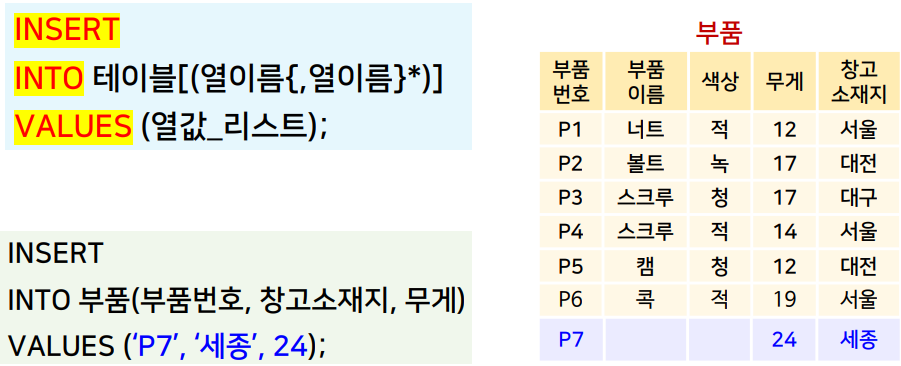 - INSERT INTO ν μ΄λΈλͺ (컬λΌλͺ , 컬λΌλͺ , ...) VALUES('컬λΌκ°', '컬λΌκ°' ...) μ ν΅ν΄ λ°μ΄ν° μ½μ μ΄ κ°λ₯ν¨.