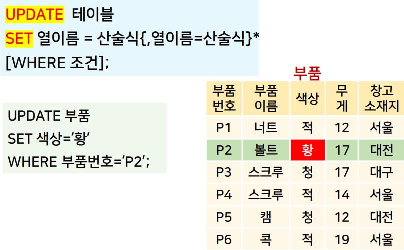 - WHERE 쑰건μ νμ©ν΄ μ΄λ€ νμ λ°κΏκ±΄μ§ λͺ μ νλ©°, SET μ ν΅ν΄ νΉμ 컬λΌμ μμ±κ°μ λ£μ΄μ μμ ν¨.