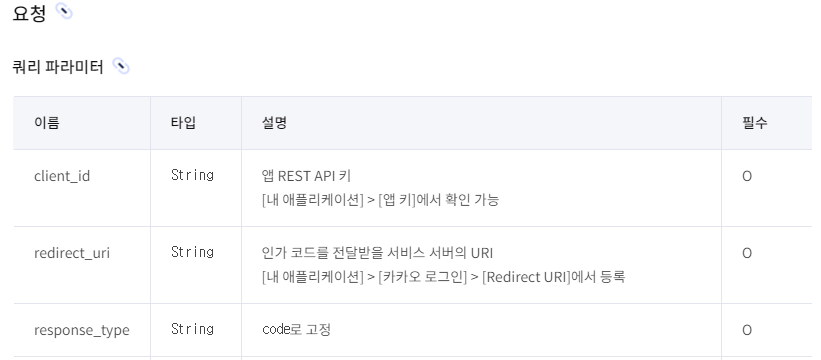 꿀팁, 해당 인가코드를 요청하는 api로 쿼리 파라미터 형식으로 필수 값을 넣어 요청을 보내게 되면 카카오 서버에서 로그인 페이지 따로 반환을 해주면서 쿼리 파라미터 응답으로 요청할 때 넣은 값을 그대로 다시 돌려주게 된다.